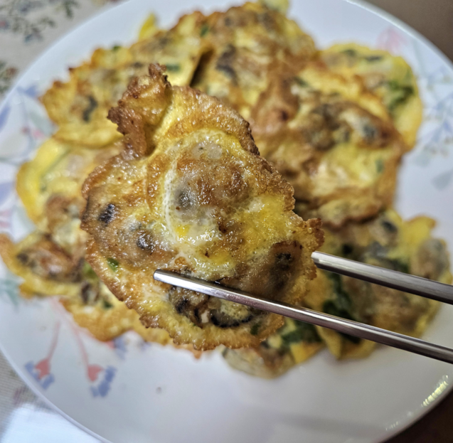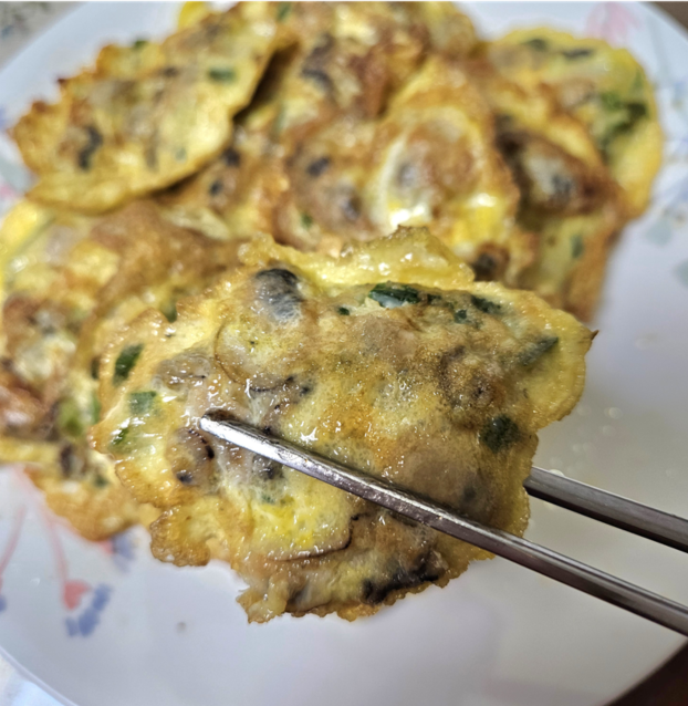 굽는 동안 퍼지는 굴 향이 정말 매력적이에요. 부드럽고 촉촉한 굴전은 따뜻할 때 바로 먹어야 가장 맛있어요.