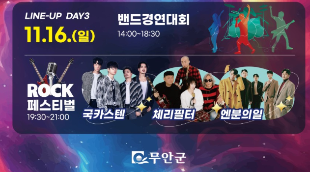 🎶 3일간 장르별 공연이 이어지며, 마지막 날에는 락페스티벌로 뜨거운 피날레를 장식해요!