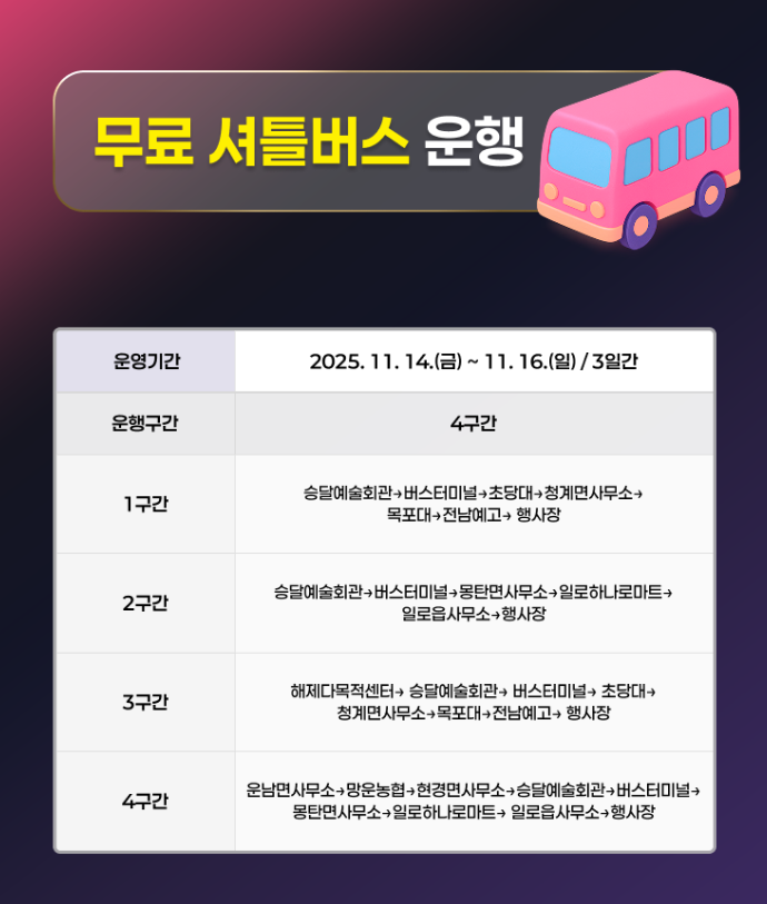 11월 14일(금)~11월 16일(일) 3일간 무료 셔틀버스를 운행합니다.