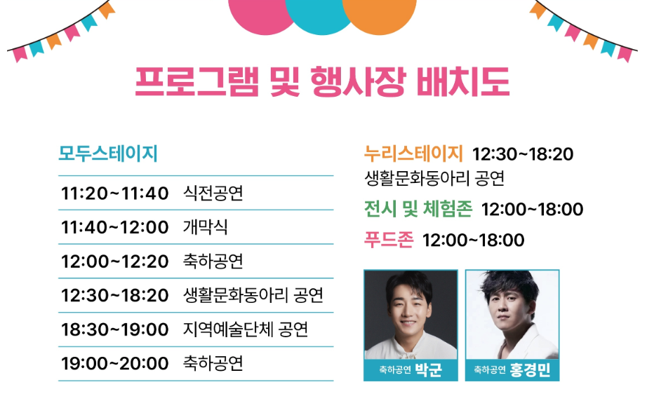 박군과 홍경민의 축하공연부터 생활문화동아리 무대, 체험·푸드존까지 모두 정리했어요.