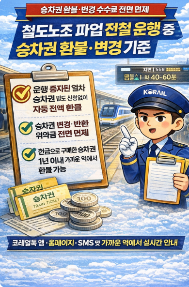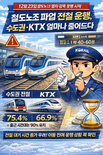 철도노조 파업 전철 운행으로 수도권 전철과 KTX가 감축됩니다. 전철 운행률, 지연 우려 노선, 환불·변경 수수료 면제 기준까지 한눈에 정리했습니다.