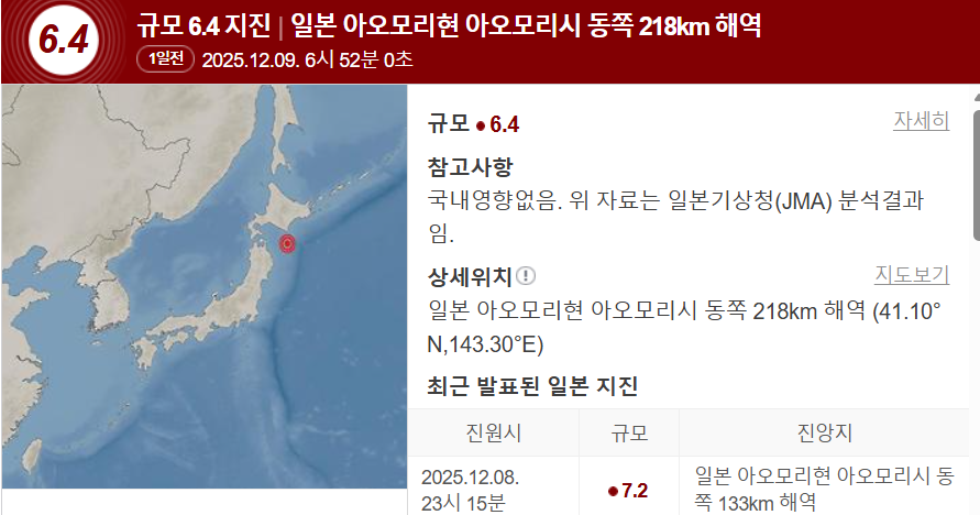 2025년 12월 9일, 아오모리현 아오모리시 동쪽 약 218km 해역에서 규모 6.4의 강진이 발생했어요.