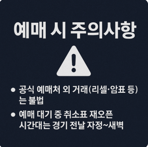 • 현장 판매: 원칙적으로 온라인만 가능하나, 취소표 발생 시 경기 시작 2시간 전 현장 판매 진행